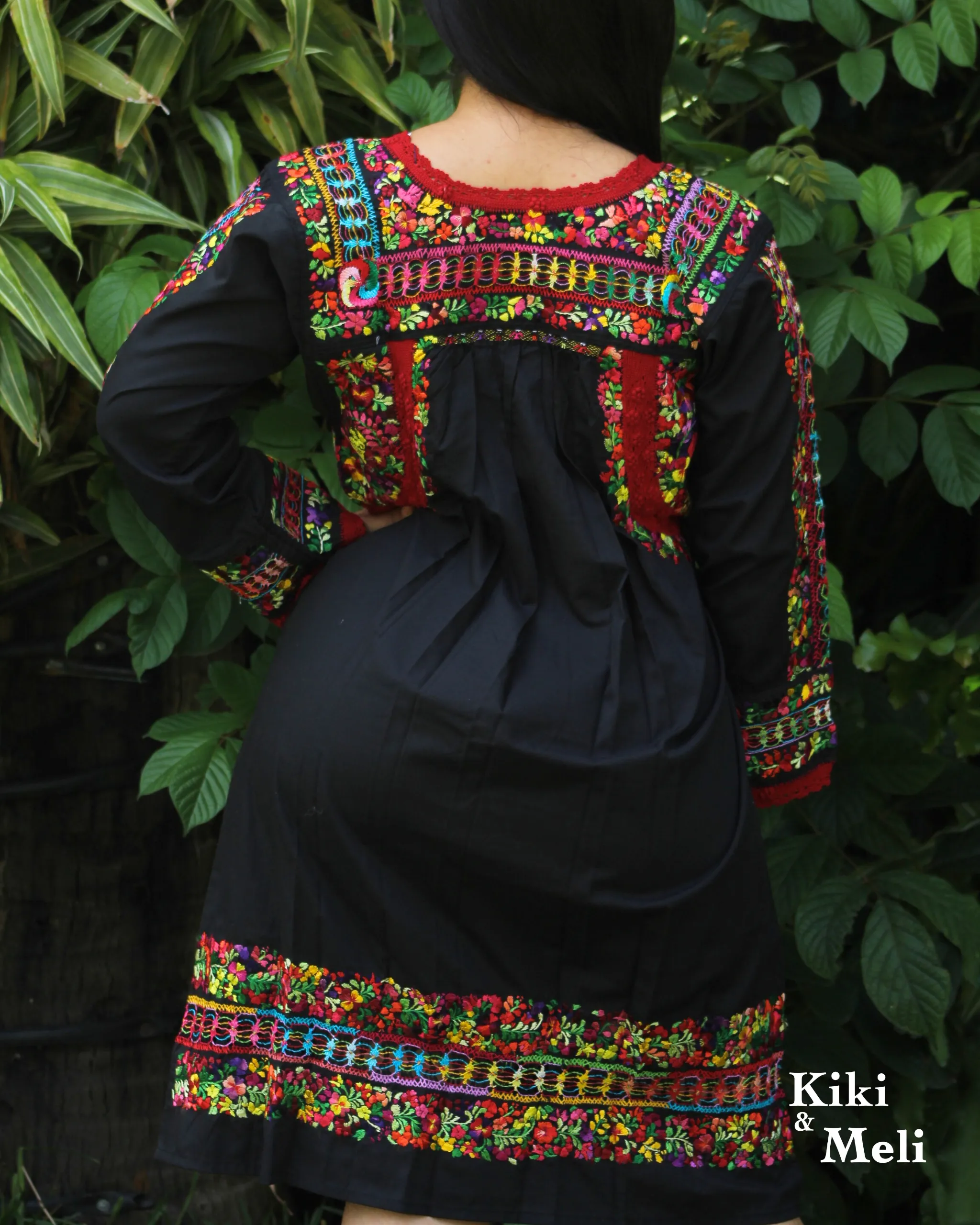 Vestido San Antonino obra de colección, negro con bordado multicolor