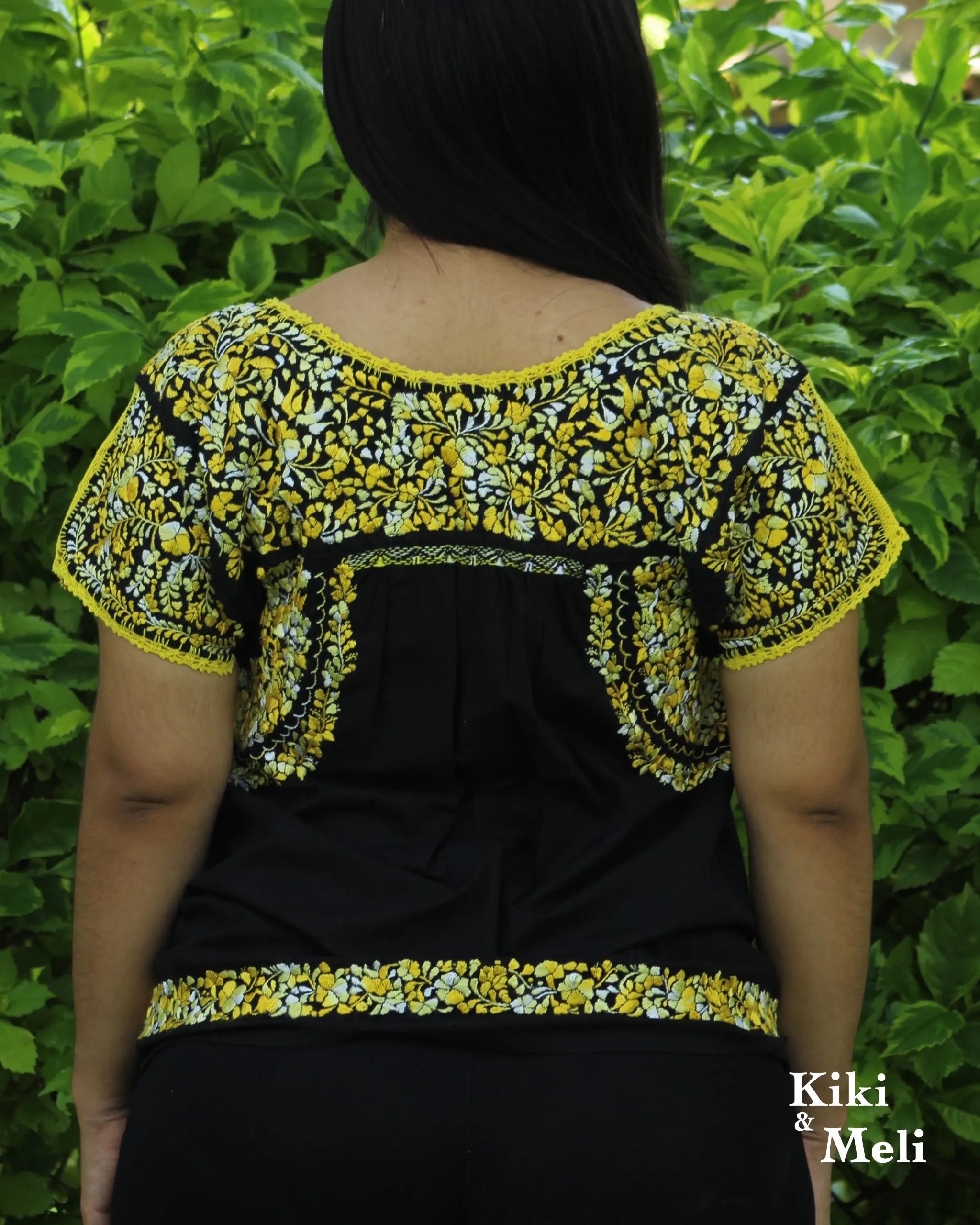 • Blusa San Antonino manga 3/4, color negro con bordado multicolor